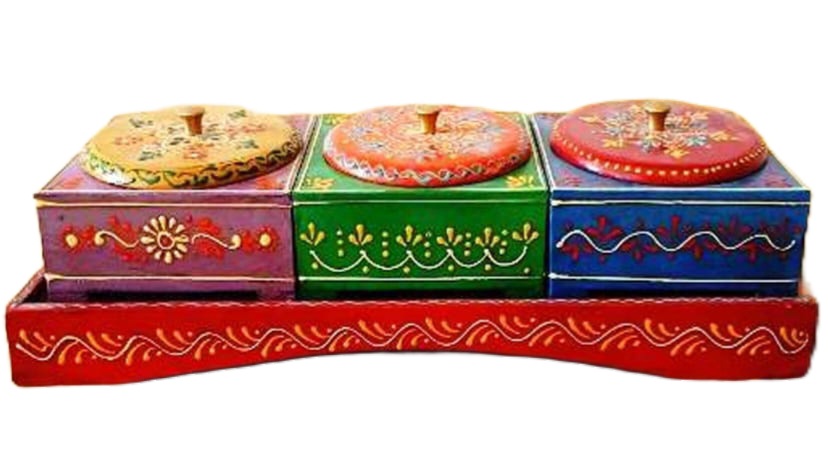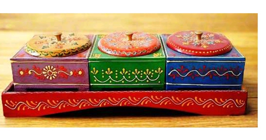 1525D. Rajasthani handicraft, Wooden tray with 3 Bowls painted, to keep dry fruits, Namkeen etc.. Size 14.5″X5.5″X4″